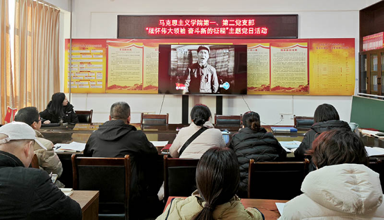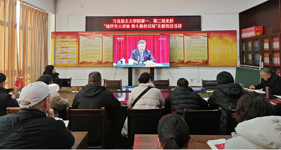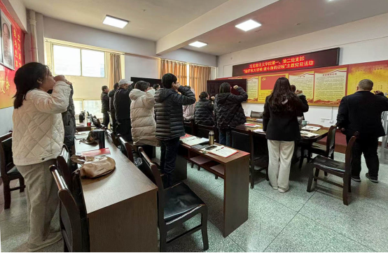 第二支部宣传委员毛学良领学了《中国共产党章程》第八章节。学习过后,全体党员面对党旗重温入党誓词。党总支副书记李世伟为闫丽华、李志红、可素芬、李锋、姚燕同志赠送了政治生日贺卡。大家一起观看了视频《高扬的旗帜—毛泽东思想成为全党指导思想》。
